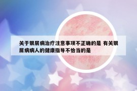 关于银屑病治疗注意事项不正确的是 有关银屑病病人的健康指导不恰当的是 皮肤病 • 10个月前 (02-10) 银屑病患者有哪些治疗注意事项 1、银屑病治疗过程中注意事项主要有以下几点:最重要的是一定要规范治疗,到正规医院规范治疗,让医生根据病情进行个体化评估,制定治疗方... 阅读 75 次 银屑病治疗患者注意事项皮疹